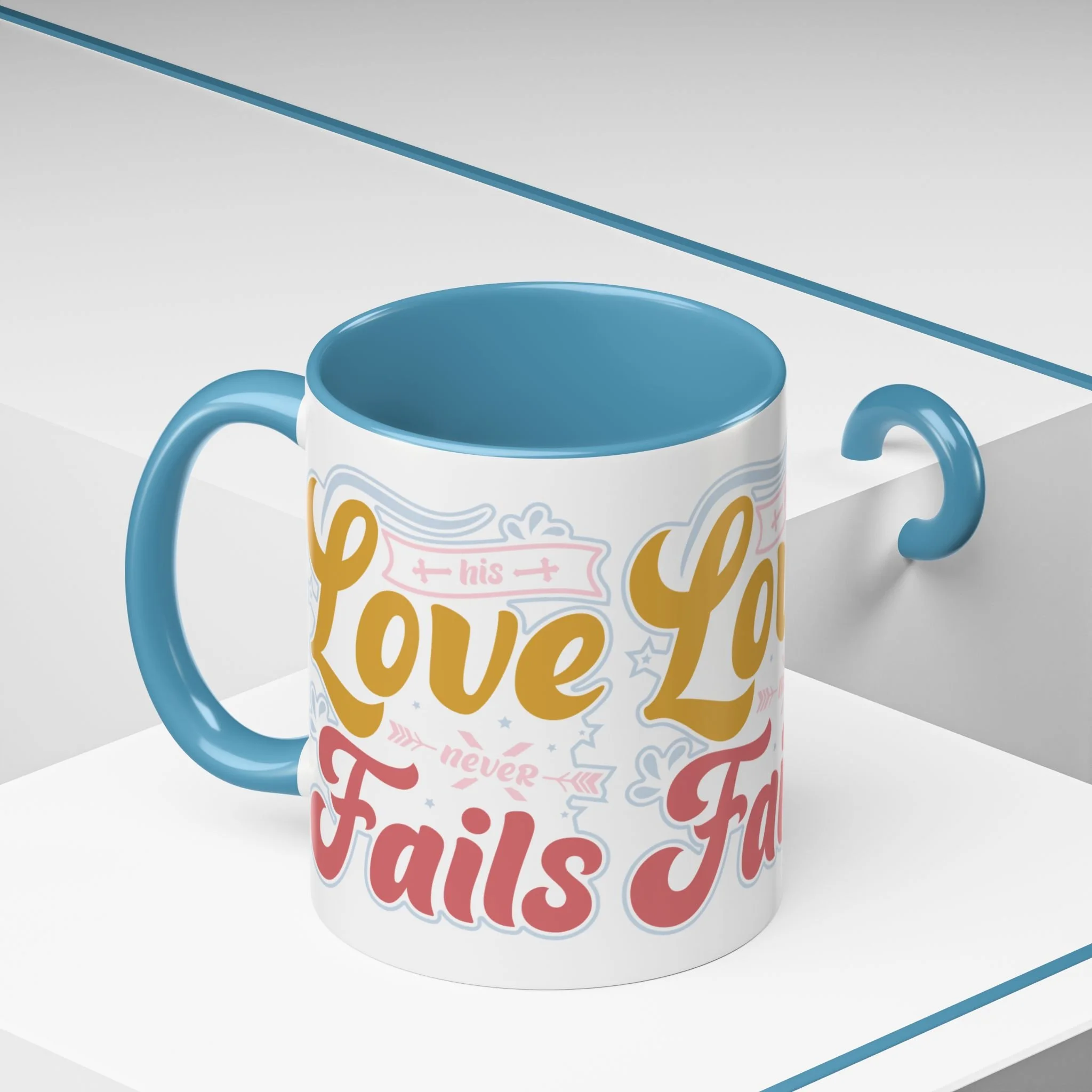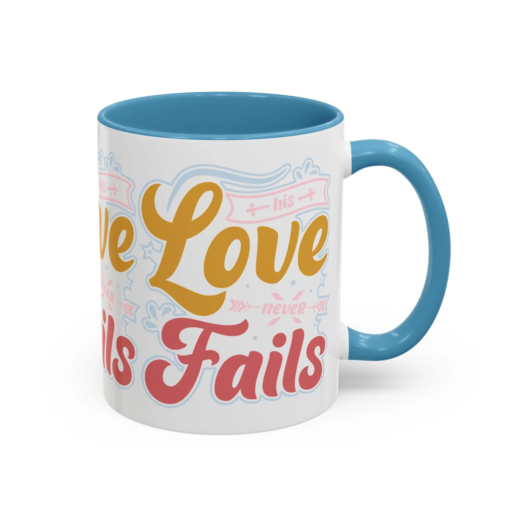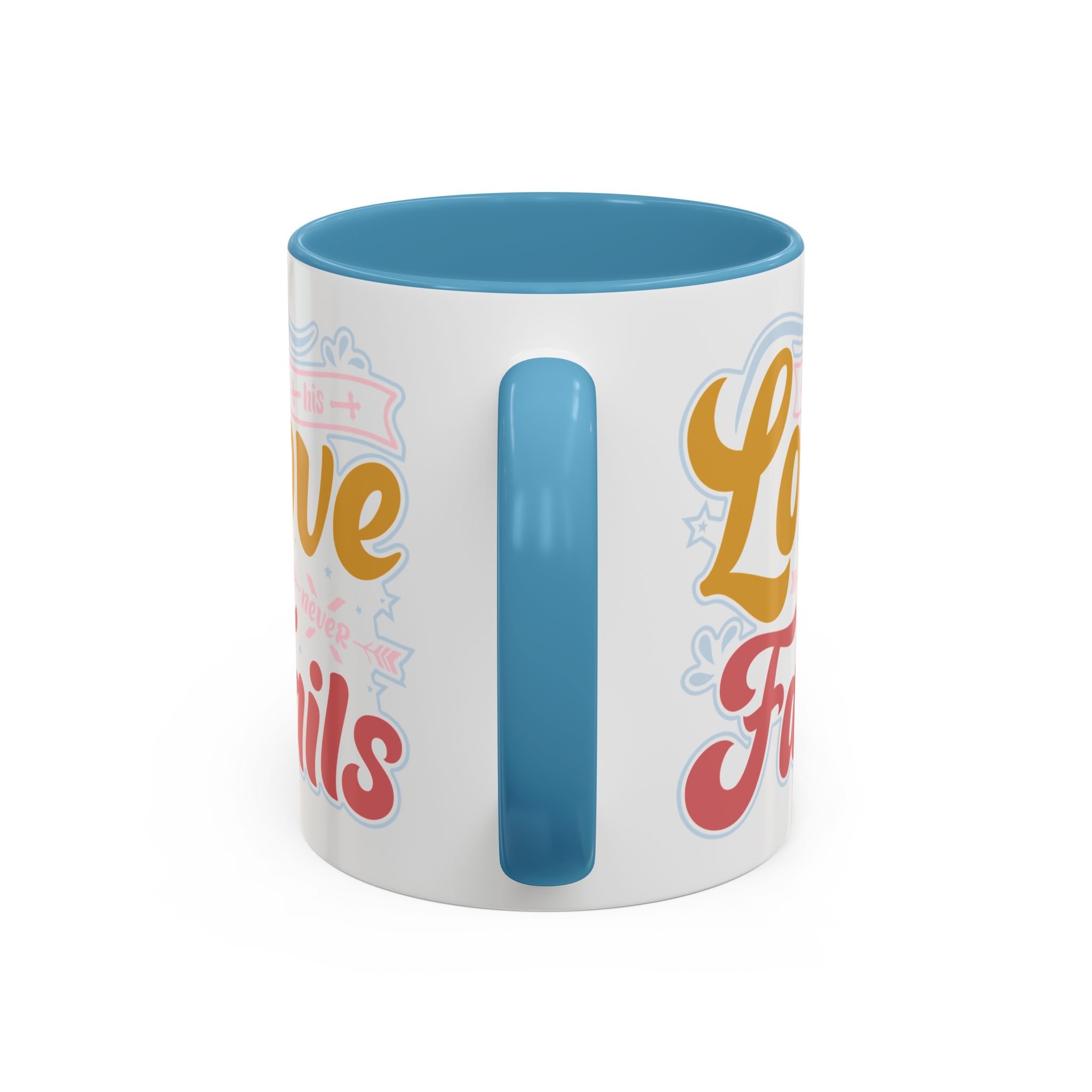 Meet your next favorite morning companion, the accented ceramic mug. The "Love Never Fails - Hope" coffee mug is perfect for your favorite hot or cold beverages. This mug brings the perfect blend of style and functionality to elevate your morning thirst. Available in 11oz, this mug offers ample space for your favorite drink. Made with white ceramic and sporting a sleek glossy finish with eye-catching contrast, this mug is a bliss both to use and to look at. The ergonomic C-shaped handle provides a comfortable grip.