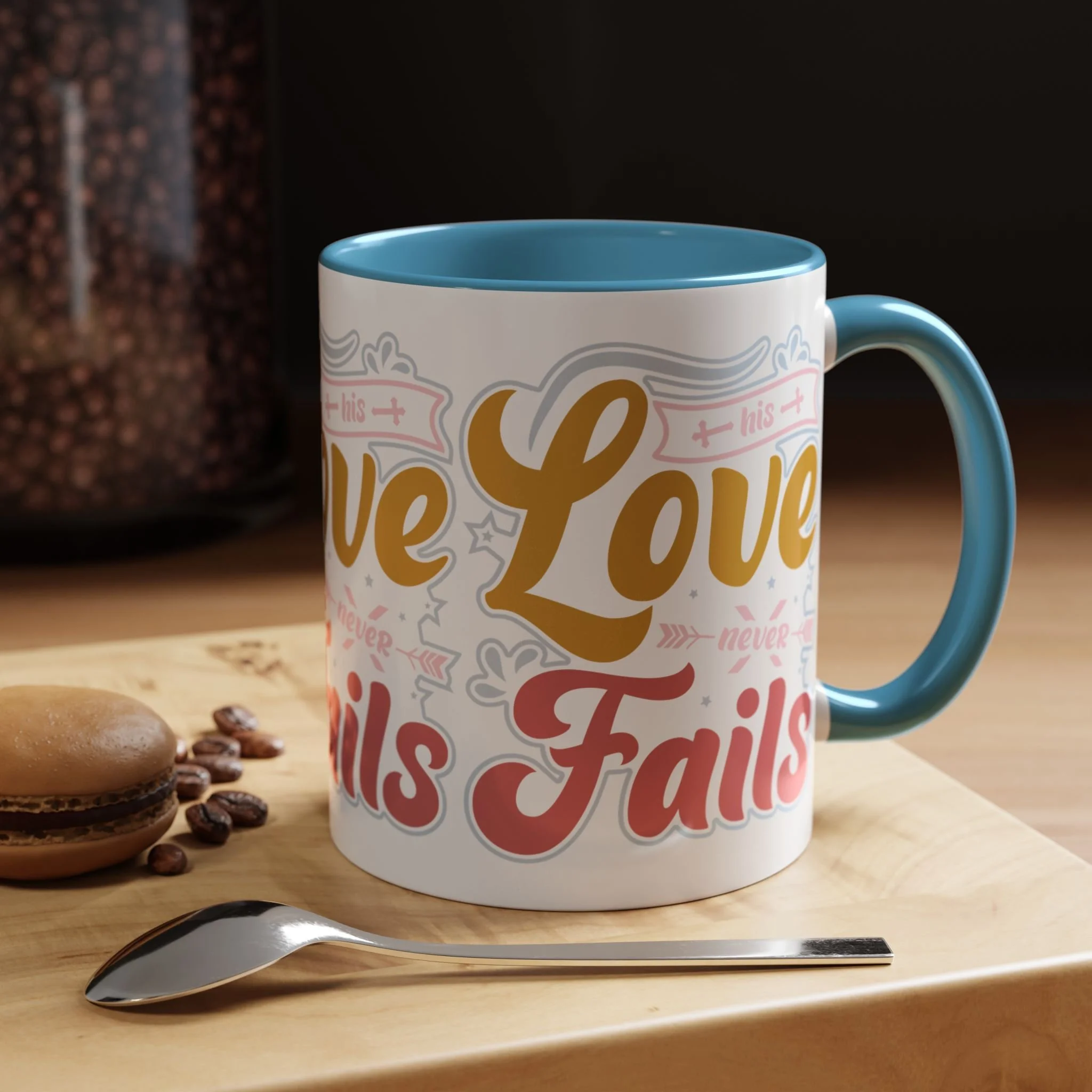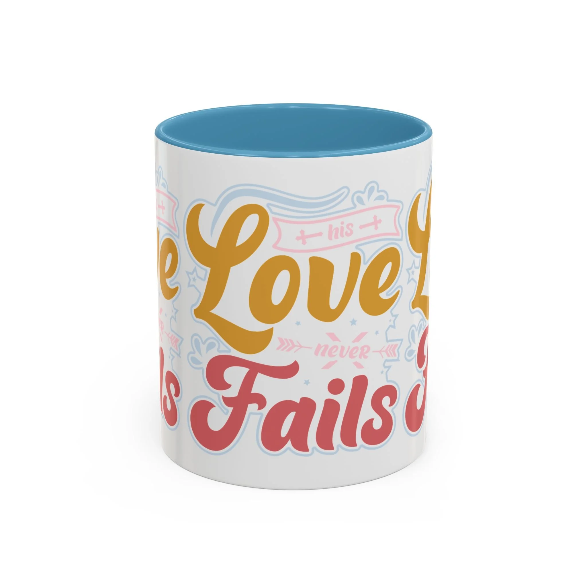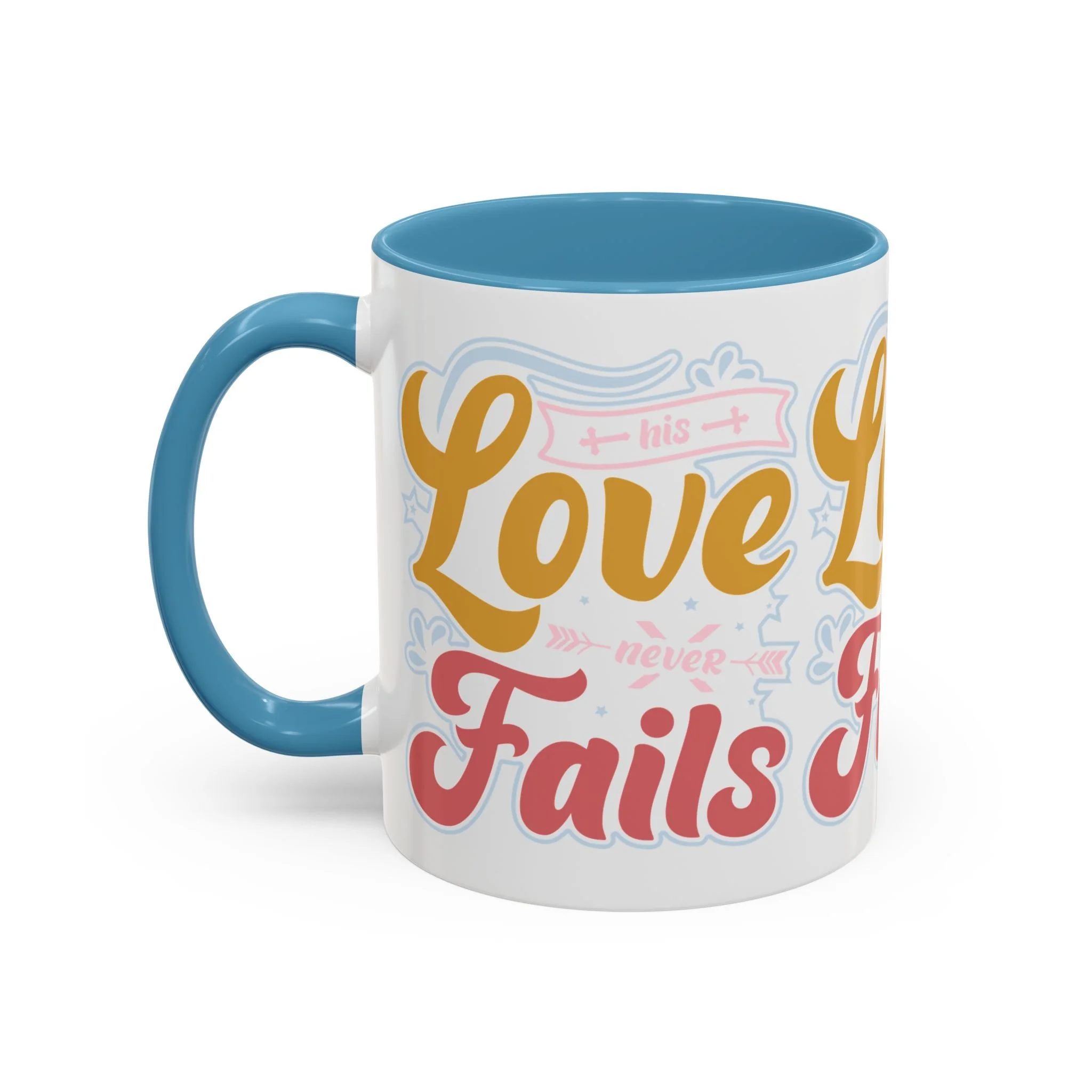 Meet your next favorite morning companion, the accented ceramic mug. The "Love Never Fails - Hope" coffee mug is perfect for your favorite hot or cold beverages. This mug brings the perfect blend of style and functionality to elevate your morning thirst. Available in 11oz, this mug offers ample space for your favorite drink. Made with white ceramic and sporting a sleek glossy finish with eye-catching contrast, this mug is a bliss both to use and to look at. The ergonomic C-shaped handle provides a comfortable grip.
